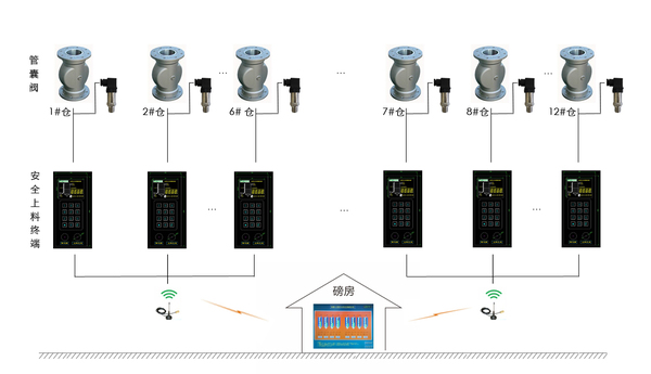上料口側(cè):上料安全控制終端、電動蝶閥,每個料倉1個,各個終端通過網(wǎng)絡(luò)連接。